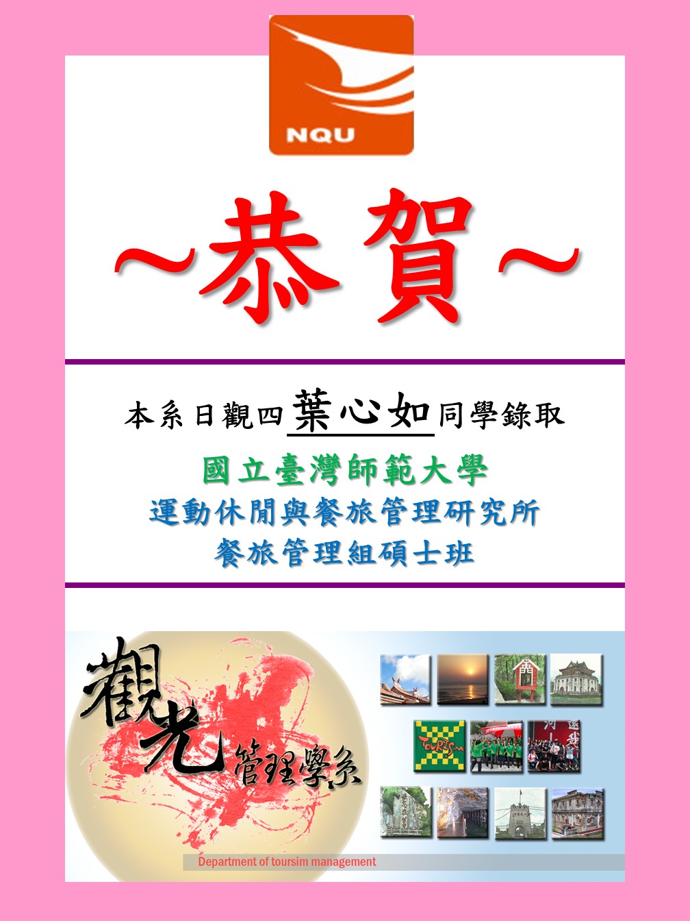 賀!!葉心如同學考取國立台灣師範大學研究所