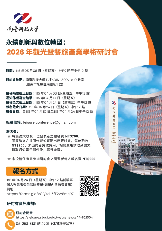 南臺科技大學辦理「永續創新與數位轉型:2026年觀光暨餐旅產業學術研討會」徵稿