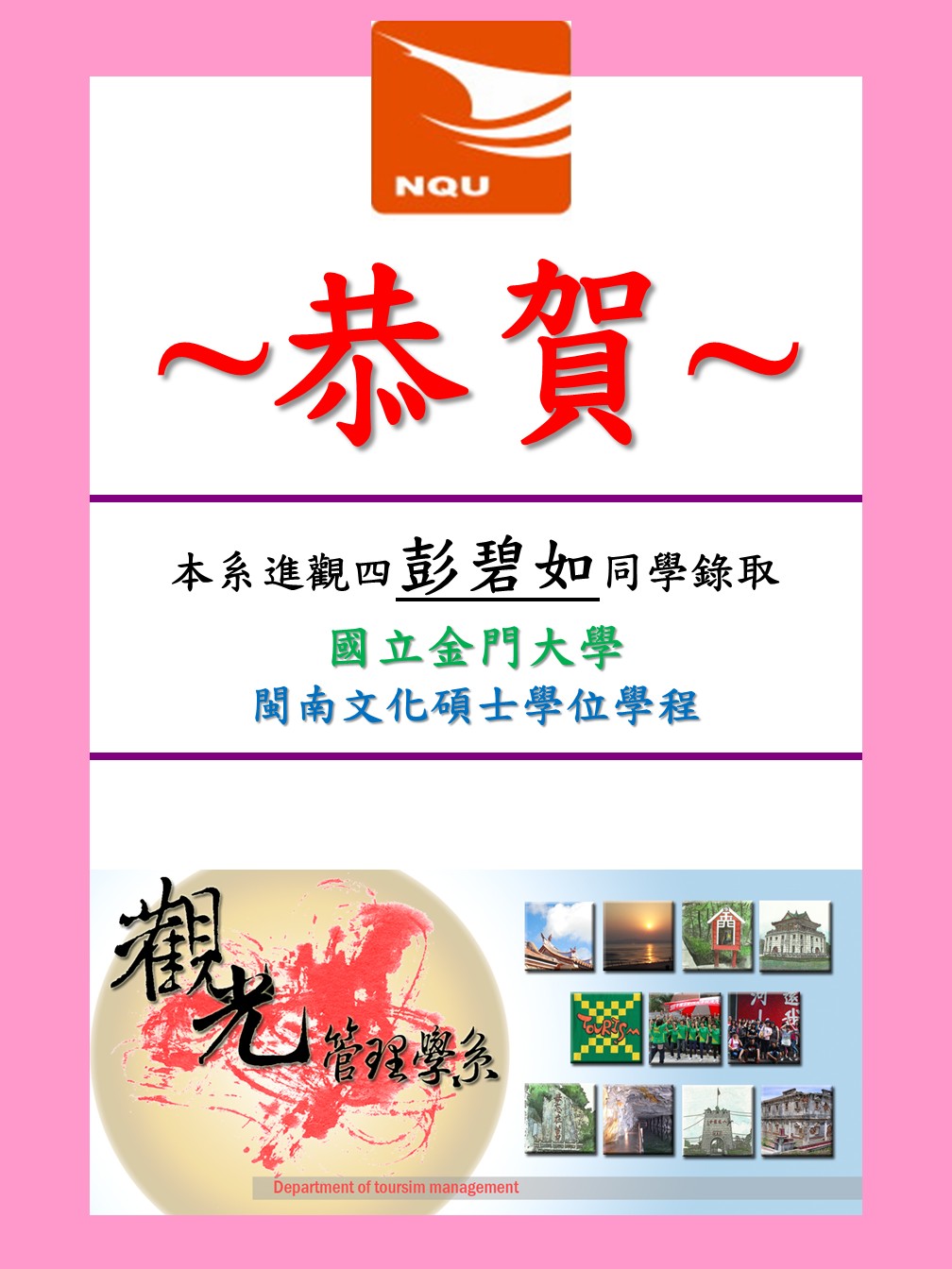 賀!!彭碧如同學考取國立金門大學閩南文化碩士學位學程